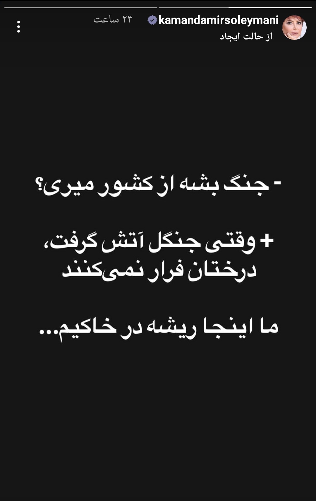 کمند امیر‌سلیمانی بازیگر و هنرمند مشهور سینما و تلویزیون با انتشار استوری‌های پر درد خود درباره جنگ مردم را متاثر کرد.