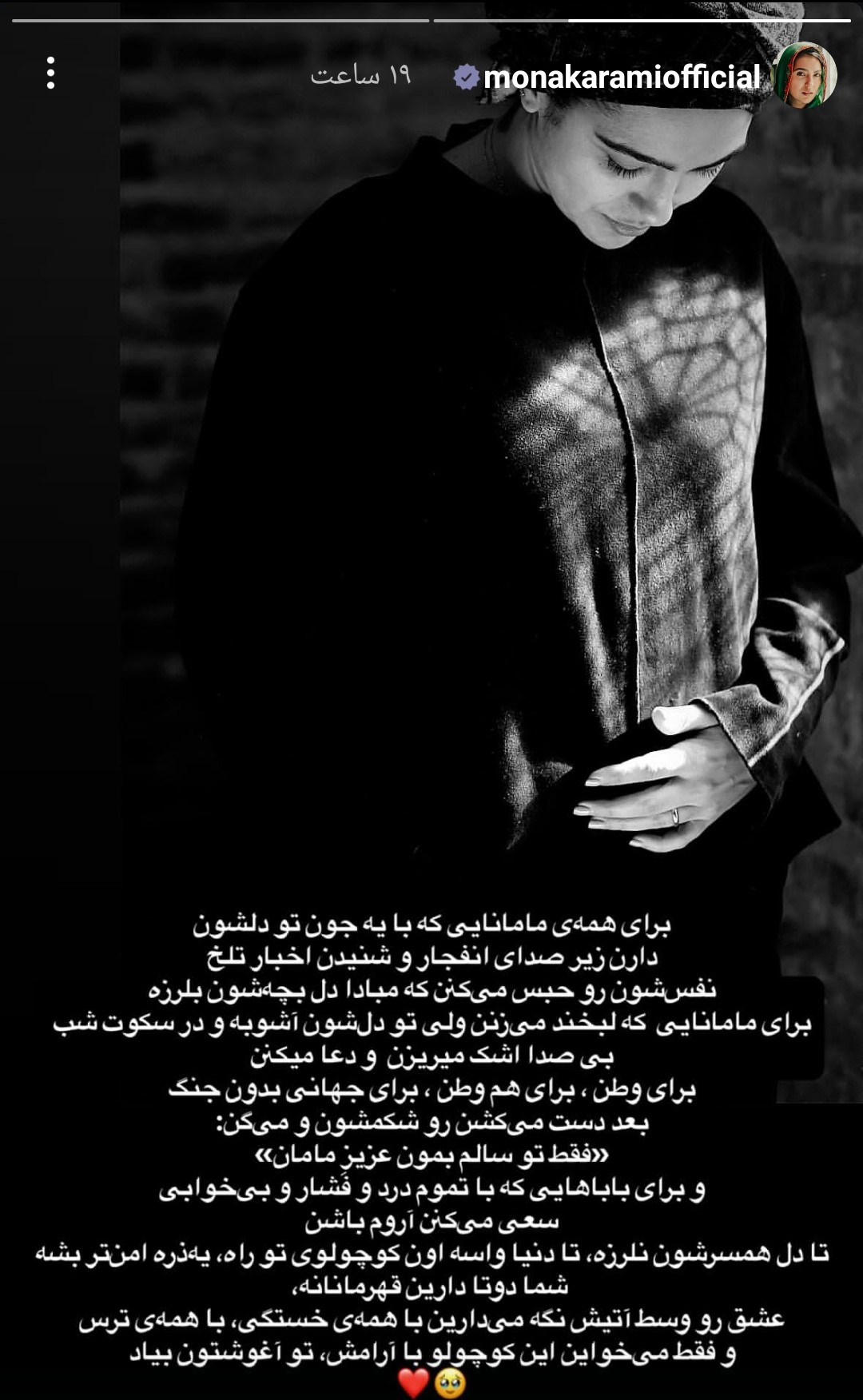 به گزارش سبک ایدهآل، در ادامه میتوانید استوری تلخ مونا کرمی درباره شرایط ماردان باردار در جنگ را مشاهده کنید.