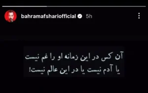 به گزارش سبک ایده آل، بهرام افشاری در اینستاگرام نوشت: آن کس در این زمانه او را غم نیست یا آدم نیست یا در این عالم نیست! این استوری در فضای مجازی بازتاب گستردهای داشته و بسیاری از کاربران با آن اظهار همدردی کردهاند.