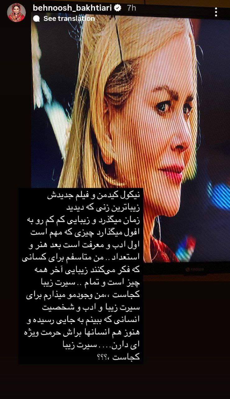 به گزارش سبک ایده آل، در پست اخیر بهنوش بختیاری، او با انتشار تصویری از نیکول کیدمن نوشت: «نیکول کیدمن برای من فقط یک زن زیبا نیست؛ او باادب، محترم و باوقار است. در دنیایی که ظاهر همه‌چیز شده، او یادآور این است که شخصیت و ادب هنوز ارزش دارد.»