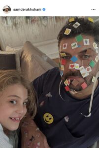 به گزارش سبک ایده آل، در این تصویر منتشر شده، شاهد یک سلفی خاص و خلاقانه هستیم. برکه، دختر با مزه سام درخشانی، با شیطنت کودکانه خود، صورت پدرش را پر از برچسبهای رنگارنگ و خندان ایموجی کرده است، بهطوری که چهره او تقریباً پوشیده شده است.