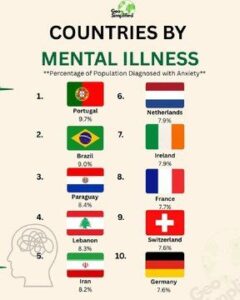 جدیدترین آمار ارائه شده کشورهای پرتغال،برزیل،پاراگوئه و لبنان،کشورهایی با بالاترین درصد تشخیص اختلال اضطراب شناخته شده اند و ایران نیز رتبه پنجم را دارد.