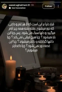 به گزارش سبک ایده آل، سعید آقاخانی نوشت: قرار دنیا بر این است که از هر غم و داغی که دور میشوی رفته رفته همه چیز آرام میگیرد و دلها سبک میشود. پس چرا این باز نمیشود؟چرا هیچ فرقی نمیکند؟ چرا داغها گداخته و داغتر میشوند؟ چرا این غصه دور نمیشود؟ چرا داغدارتر میشویم؟