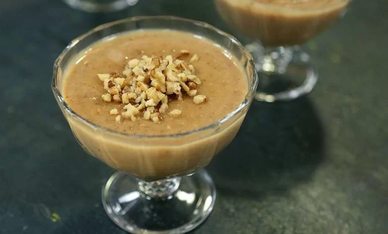 پودینگ را در لیوان ها یا کاسه های سرو بریزید و روی آن را با خامه فرم گرفته و مغز گردو تزئین کنید.