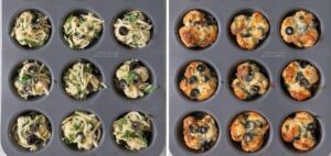 قالب مافین را در طبقه وسط فر قرار می دهیم تا پیتزاهای لقمه ای برای مدت ۱۵ دقیقه در فر بپزند و رویه آن ها طلایی شده و پنیر موزارلا آب شود.